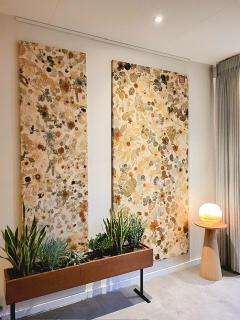 Elk wandkleed wordt met de hand geprint en draagt de afdrukken van bloemen, bladeren en planten die met aandacht zijn gekozen en verwerkt. Er ontstaat een spel van natuurlijke patronen en zachte kleurtonen, waardoor ieder stuk uniek is en een rustige, tijdloze uitstraling krijgt.